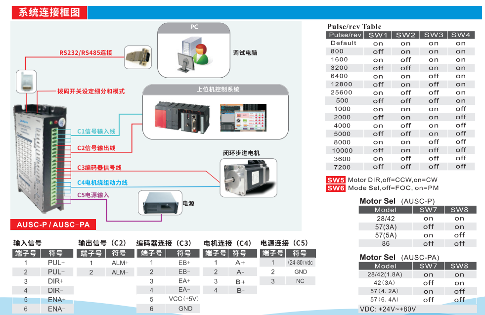 工作電壓:直流輸入電壓24VDC~80VDC,推薦工作電壓48V 連續(xù)輸出電流最大值8.2A,最大峰值電流13A(先進的步進伺服過載能力) 可接受差分和單端式脈沖/方向指令,控制指令最大脈沖頻率為500KHz(出廠默認為200KHz) 脈沖,方向和使能信號輸入接口電平為4.5-28V兼容 采用FOC磁場定位控制技術和空間矢量脈寬調制(SVPWM)閉環(huán)控制技術 采用了先進的變電流技術和變頻技術,有效的降低了電機和驅動器的發(fā)熱 每圈脈沖數(shù)可通過調試軟件或拔碼設定(細分) 具有過壓、欠壓、過流和超差等保護功能 具有串口RS232調試功能,但需使用本公司專用的串口調試線聯(lián)系艾而特